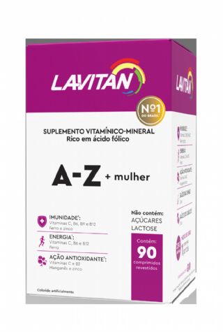 Vitamina Lavitan A - Z Mulher 60 comprimidos Vitamina Lavitan A - Z Mulher 60 comprimidos Benefícios - O Zinco, o Ferro e as vitaminas C, B6, B9 e B12 auxiliam no funcionamento do sistema imune; - A vitaminas C, B6, B12 e o Ferro auxiliam no metabolismo energético; - O Zinco contribui para a manutenção do cabelo, da pele e das unhas.