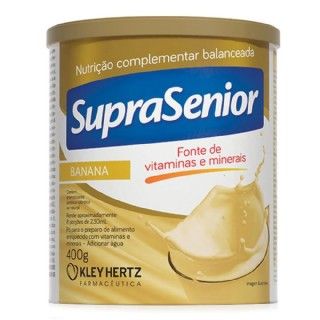 Suprasenior Suplemento Alimentar 400g Banana Suprasenior Suplemento Alimentar 400g Banana INDICAÇÕES SupraSenior é uma linha de produtos para nutrição complementar compostos por vitaminas, minerais, fibras e macronutrientes, entre eles a proteína. Sua fórmula foi desenvolvida para suplementar a alimentação de pessoas acima de 40 anos e contém 27 vitaminas e minerais, como as vitaminas B1,B2,B6,B12,E,K,C,D, ácido fólico, cálcio, ferro, zinco, selênio, biotina entre outros. SupraSenior possui em sua composição um mix de lipídios que garante um produto isento de gorduras trans e com baixo teor de gorduras saturadas além de conter um mix de fibras composto de polidextrose, inulina e oligofrutose. Contém lacre peel off que garante maior segurança e praticidade ao abrir a lata. Acompanha colher medidora dentro da lata. SupraSenior é Isento de glúten. Cada lata rende aproximadamente 8 porções de 230ml. Disponível nos sabores Baunilha, Chocolate, Banana e Morango.