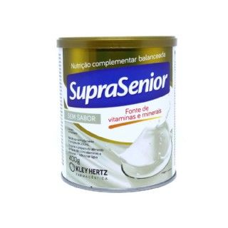 Suprasenior Suplemento Alimentar 400g Sem Sabor Suprasenior Suplemento Alimentar 400g Sem Sabor INDICAÇÕES SupraSenior é uma linha de produtos para nutrição complementar compostos por vitaminas, minerais, fibras e macronutrientes, entre eles a proteína. Sua fórmula foi desenvolvida para suplementar a alimentação de pessoas acima de 40 anos e contém 27 vitaminas e minerais, como as vitaminas B1,B2,B6,B12,E,K,C,D, ácido fólico, cálcio, ferro, zinco, selênio, biotina entre outros. SupraSenior possui em sua composição um mix de lipídios que garante um produto isento de gorduras trans e com baixo teor de gorduras saturadas além de conter um mix de fibras composto de polidextrose, inulina e oligofrutose. Contém lacre peel off que garante maior segurança e praticidade ao abrir a lata. Acompanha colher medidora dentro da lata. SupraSenior é Isento de glúten. Cada lata rende aproximadamente 8 porções de 230ml. Disponível nos sabores Baunilha, Chocolate, Banana e Morango.